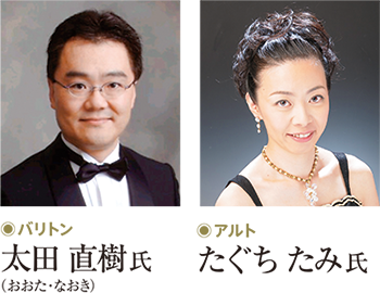 バリトンは東京藝術大学卒業・同大学院修了、その後シュトゥットガルト音楽大学を修了し、帰国後日本全国で活躍を続ける志音会のエース太田直樹氏(31回・二期会会員)、アルトは東京芸術大学で学んだ後、東京と長野を中心に活躍し、志音会の合唱指導もして頂いているたぐちたみ氏(39回)です。